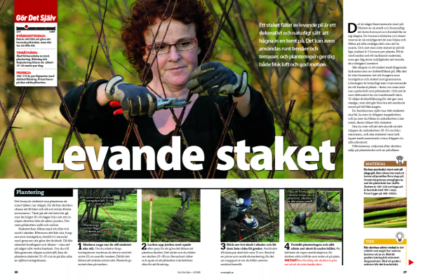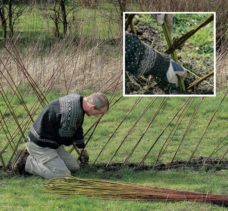 Staketet kan flätas med ett eller två skott i sänder. Eftersom det här ska fungera som tomtgräns, beslöt vi i samråd med grannen att göra det dubbelt. Då blir staketet kraftigare och tätare - utan att på något sätt verka bastant. Om du vill låta grannen slippa underhåll, kan du plantera staketet 15-25 cm in på din sida av själva tomtgränsen.