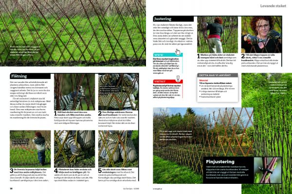 Nu har staketet flätats färdigt, men det står lite ostadigt och lutar åt än den ena, än den andra sidan. Topparna på skotten är inte lika långa och det ser lite rörigt ut. Den sista delen av arbetet är att stabilisera staketet och göra det snyggt. Det är både lätt och trevligt. Använd ev. vattenpass om du inte är säker på ögonmåttet.