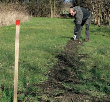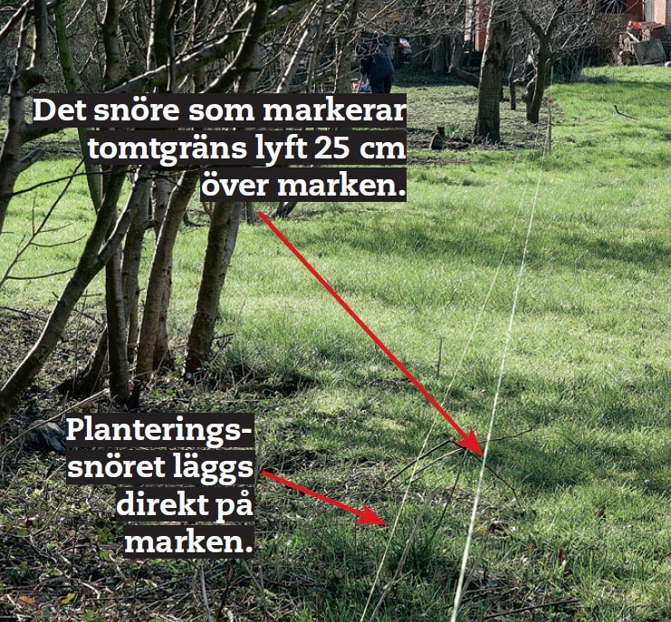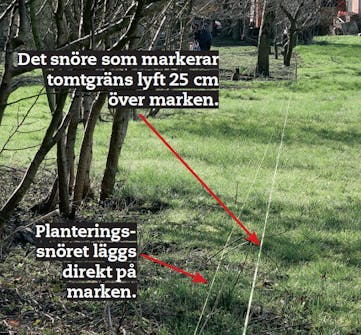 Markera noga var du vill staketet ska stå. Om du arbetar längs tomtgränsen markerar du denna med ett snöre 25 cm ovanför marken. Då blir det lättare att sträcka snöret rakt. Planteringssnöret dras på marken.