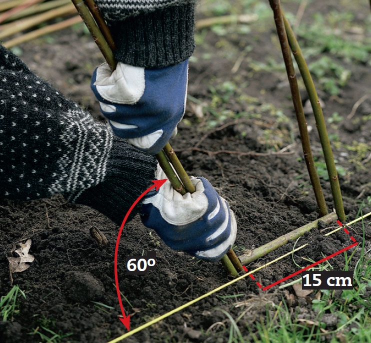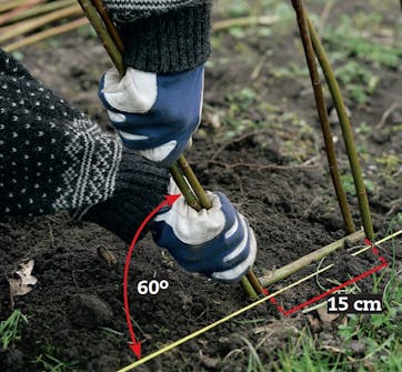 Stick ner två skott i sänder och låt dem luta cirka 60 grader. Avståndet till nästa par skott bör vara 15 cm. Använd en pinne som avståndsmarkering, för det ser snyggast ut om du håller samma avstånd överallt.