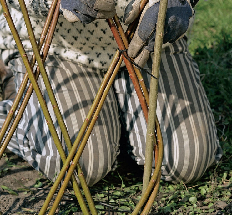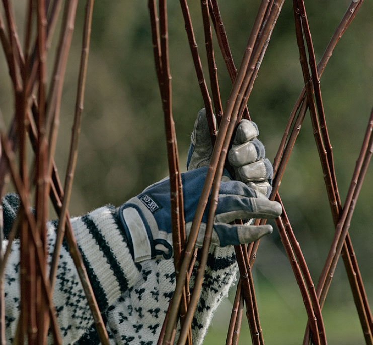 Det var kanske lite arbetskrävande att plantera pilskotten, men själva flätningen handlar mera om trivsamt och noggrant arbete. Det är ju nu som du ska skapa ordning i det kaos av skott som står i en lång rad.