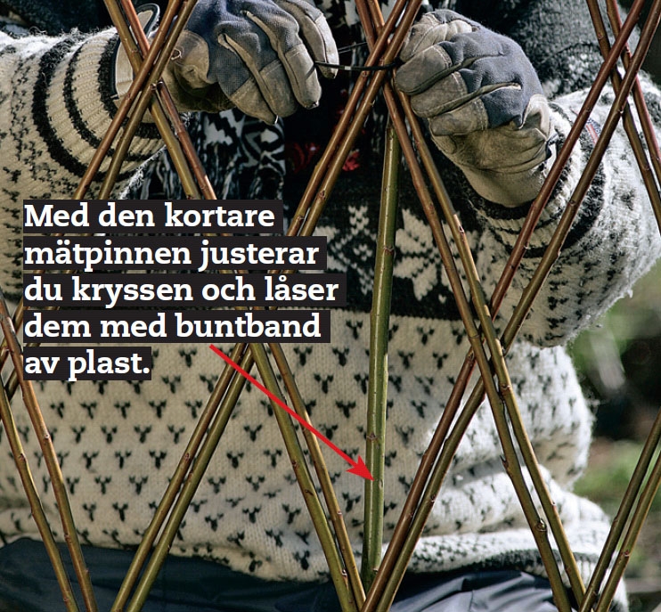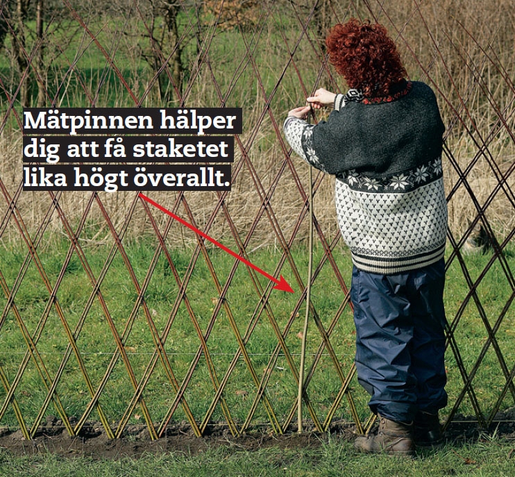 För att mönstret i staketet ska bli enhetligt behöver du två mätpinnar. Med dessa kollar du varje skott två gånger och låser sedan flätningen med buntband. Den ena mätpinnen ska ha en markering för krysset en och en halv ruta ovanför marken. Den andra ska ha en markering för de översta kryssen.
