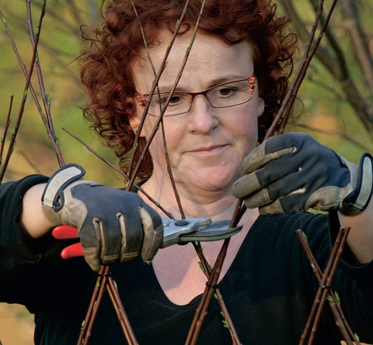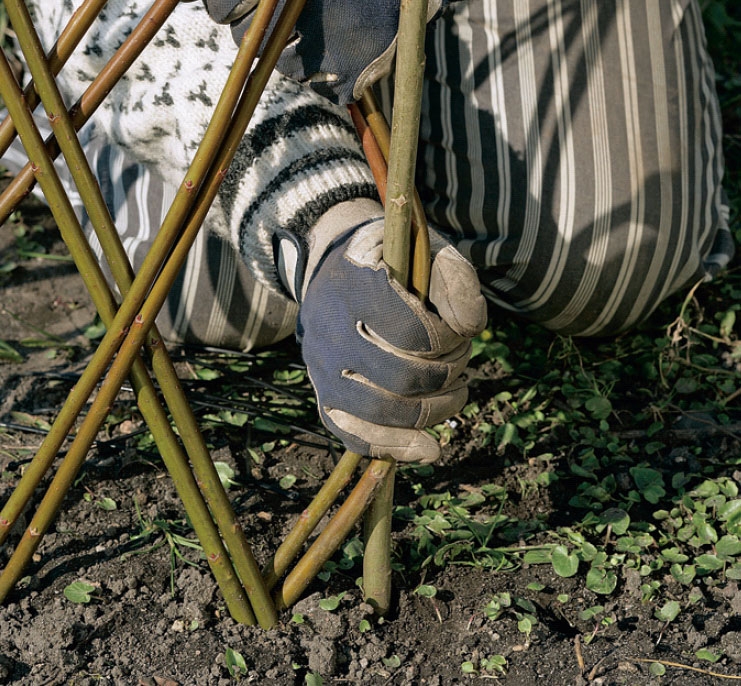 Pilstaketet kan både avsluta och börja med en kraftigare pil. Här valdes ett skott som är ett par år och så kraftigt att det tål att du flätar runt det. Alla nya skott flätas sedan in i staketet igen.