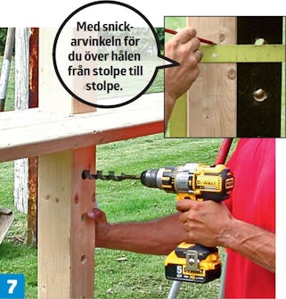 Mittstolpen ställs sedan löst på terrassen så att den passar i hålet mitt i taket, och i alla stolpar borras hål för bärpinnarna.