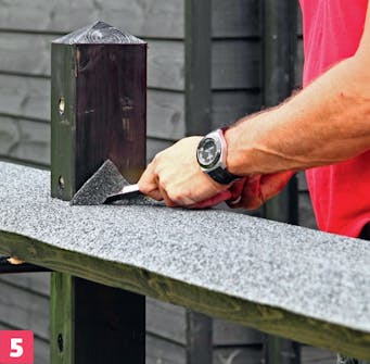 Träet ska ha en omgång olja eller annat träskydd innan vi lägger tak papp ovanpå. Det kan du göra med taket lagt på ett par bockar, men då vi här ger det samma svarta träolja som stolparna har fått tidigare, lägger vi det på plats innan vi målar.