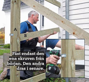 Markera placeringen av spikreglarna B på stolparna A. Då kan du räkna ut var skruvarna ska sitta och förborra för dem.