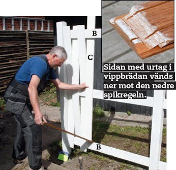 Brädan sågar du till av en hyvlad bräda på 22 x 95 mm som ska vara cirka en meter. I den ena änden sågar du ett urtag på ena sidan. Det ska sedan läggas över den nedre spikregeln när brädorna tvingas på plats.