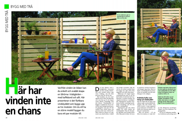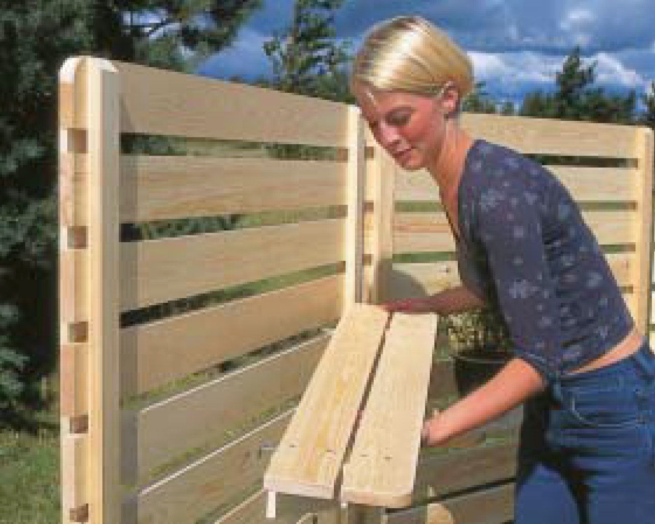 Varje segment sätts ihop av 12 brädor och 4 stolpar. Dra ett streck på var 12:e cm på stolparna och lägg brädorna längs strecken. Fäst brädorna på stolparna med en dyckert.