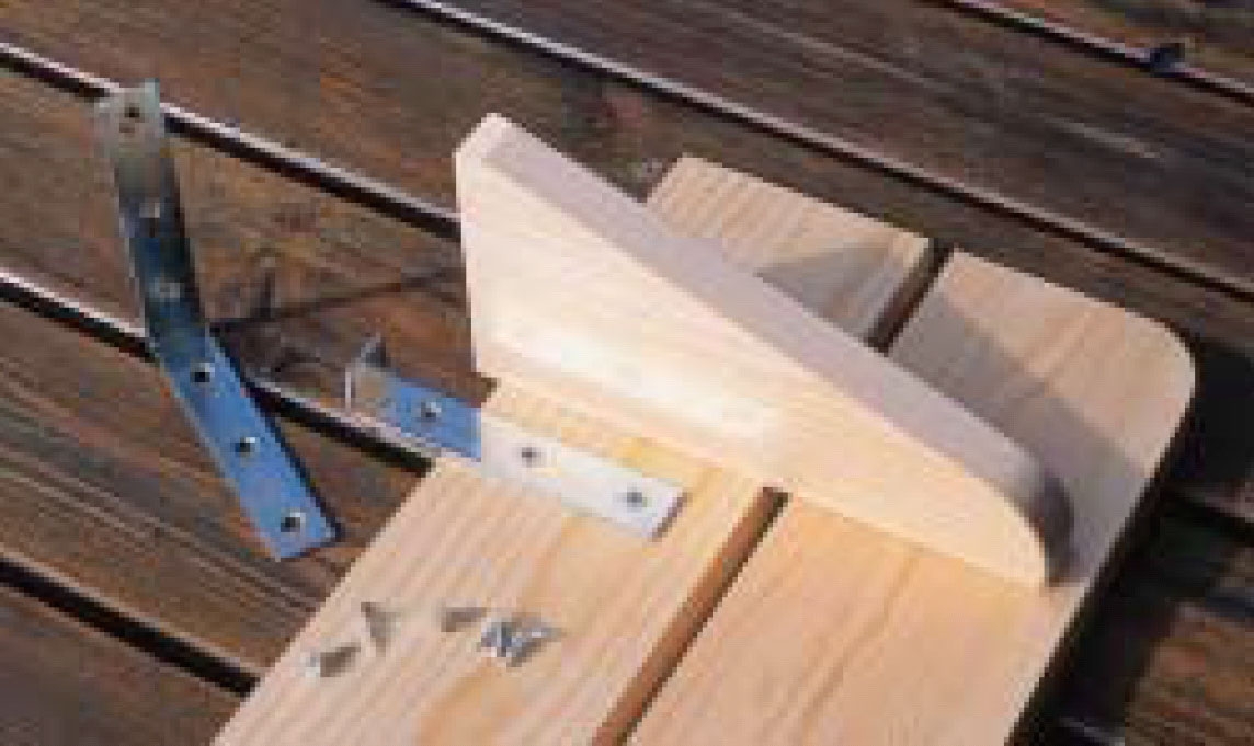 Vinkeljärnen sticks in i en springa och håller hyllan på plats på brädans övre kant. Hyllstödet vilar då mot brädan.