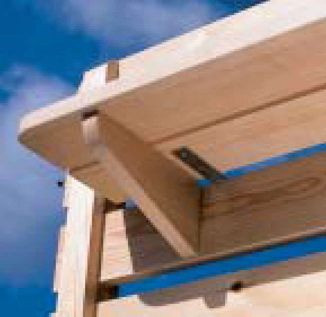 Till de två yttre segmenten används en skruvögla nertill och en upptill: Markera stolpens och öglornas placering på brädan. Denna ska skjuta ut 3 cm utanför stolpen. Borra ett 18 mm hål genom brädan samt ett 6 mm hål i kortändan och rakt in genom det större hålet.