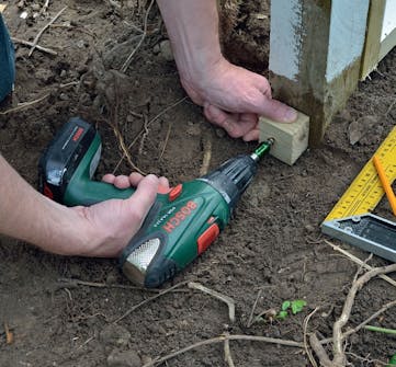 Skruva fast klossar på stolparna. Sätt dem där ramarnas underkant ska hamna och använd klossarna som stöd för ramarna. Då går det lätt att sätta ramarna på plats och skruva fast dem.