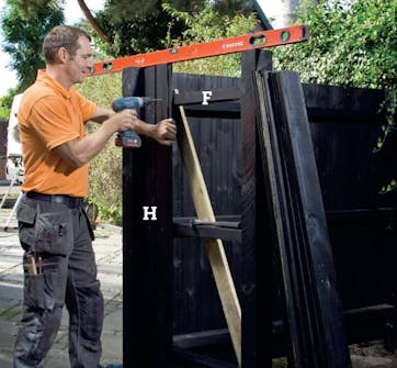 Kolla avståndet mellan grindens låssida och stolpen (här är det en trappa). Beroende på vilken teknik du har valt vid monteringen av brädor, så kan den sista brädan vara halv. Fixera grinden medan du skruvar fast brädorna.