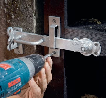 Nu återstår endast några små detaljer innan plank och grind är klara. Först ska vi montera en grindklinka på grinden, så att den förblir stängd när den har stängts. Vi monterar också en dörrhållare nertill på vinkeln och motsvarande beslag på grinden, så att den kan hållas fast i öppet läge utan att blåsa igen.