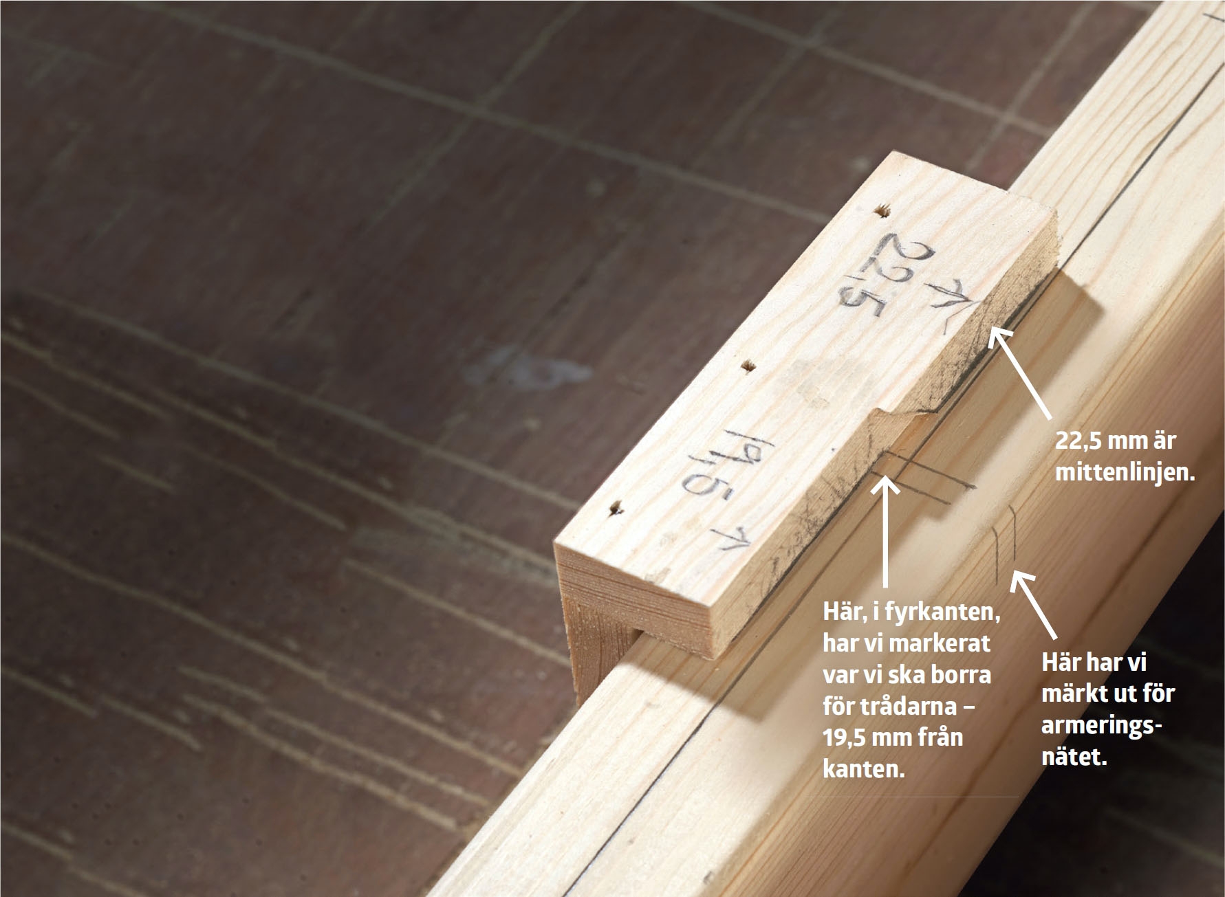 Hålen för armeringsnätet borras förskjutna från mitten, då trådarna i nätet sitter förskjutet. För att få hålen där de ska vara bygger vi en mall att markera efter. Mallen har två mått. Det ena är 22,5 mm, det andra är 19,5 mm. 22,5 mm motsvarar mitten av träet. 19,5 mm är 3 mm från mitten, vilket motsvarar trådarnas tjocklek.