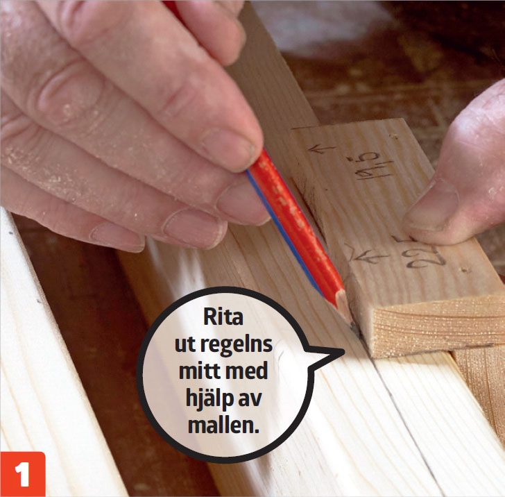Mitten ritas ut. Regeln är 45 mm, så när vi ritar ut efter 22,5 mm-måttet hamnar vi i mitten. Gör det på alla fyra delarna av ramen. Använd sedan mallens andra mått, 19,5 mm, till att markera var hålen ska vara.