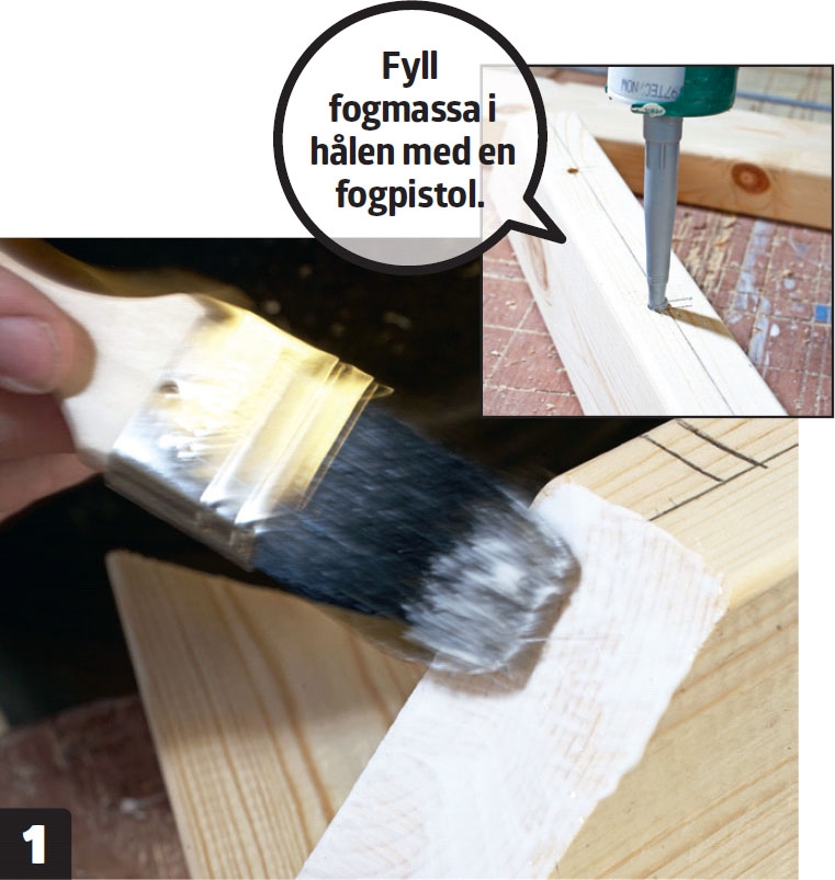 Alla hörnfogarna limmas. Använd vattenfast trälim. Det skyddar även fogarna mot vatten. Fyll hålen för armeringsnätet med fogmassa.