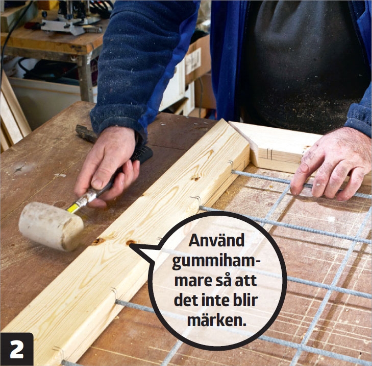 Nu ska vårt sektionsstaket monteras! Det görs genom att överliggaren och de två sidorna byggs ihop till ett U. Nätet sticks in i de borrade hålen och slås på plats, så att hörnfogarna blir täta. Till sist sätts botten dit, och ramen är hel.
