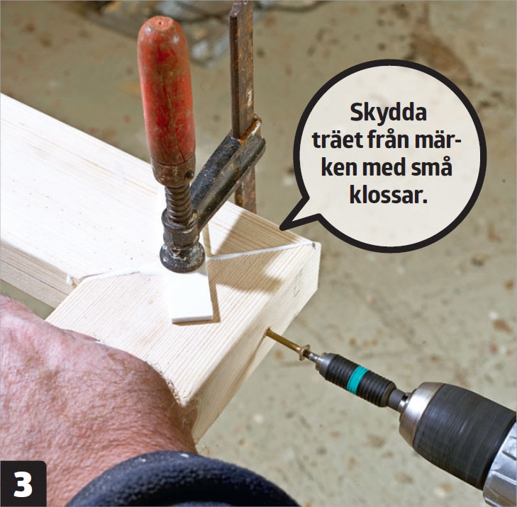 Fixera fogarna med en skruvtving. Så att du kan vara säker på att de blir helt exakta. Skruva 2 st. 5 x 100 mm skruvar i varje hörn. Spänn dem så hårt att limmet bubblar ut i skarvarna.