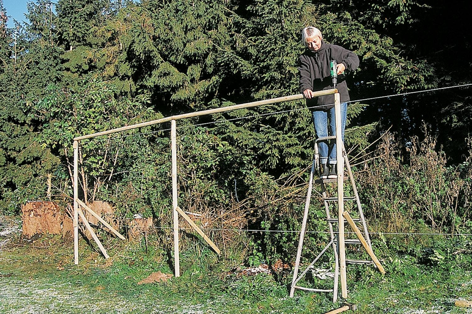 Trädgårdsstängsel kan enkelt fästas med så kallade tentorstolpar. De gröna stolparna har ett smart plasthuvud som kan hålla fast den översta tråden på trädgårdsstaketet.