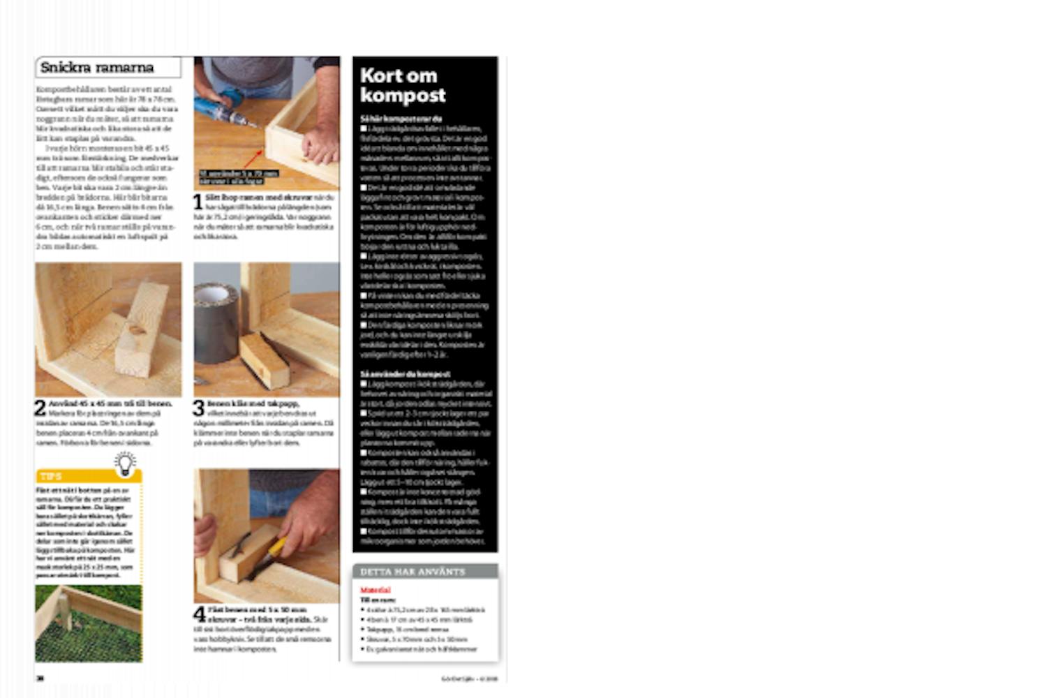 Kompostbehållaren består av ett antal löstagbara ramar som här är 78 x 78 cm. Oavsett vilket mått du väljer ska du vara noggrann när du mäter, så att ramarna blir kvadratiska och lika stora så att de lätt kan staplas på varandra.