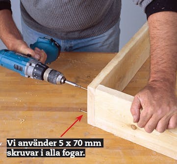 Sätt ihop ramen med skruvar när du har sågat till brädorna på längden (som här är 75,2 cm) i geringslåda. Var noggrann när du mäter så att ramarna blir kvadratiska och lika stora.