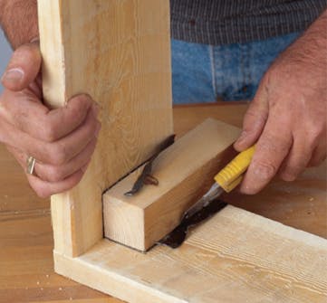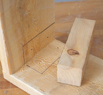I varje hörn monteras en bit 45 x 45 mm trä som förstärkning. De medverkar till att ramarna blir stabila och står stadigt, eftersom de också fungerar som ben. Varje bit ska vara 2 cm längre än bredden på brädorna. Här blir bitarna då 16,5 cm långa. Benen sätts 4 cm från ovankanten och sticker därmed ner 6 cm, och när två ramar ställs på varandra bildas automatiskt en luftspalt på 2 cm mellan dem.