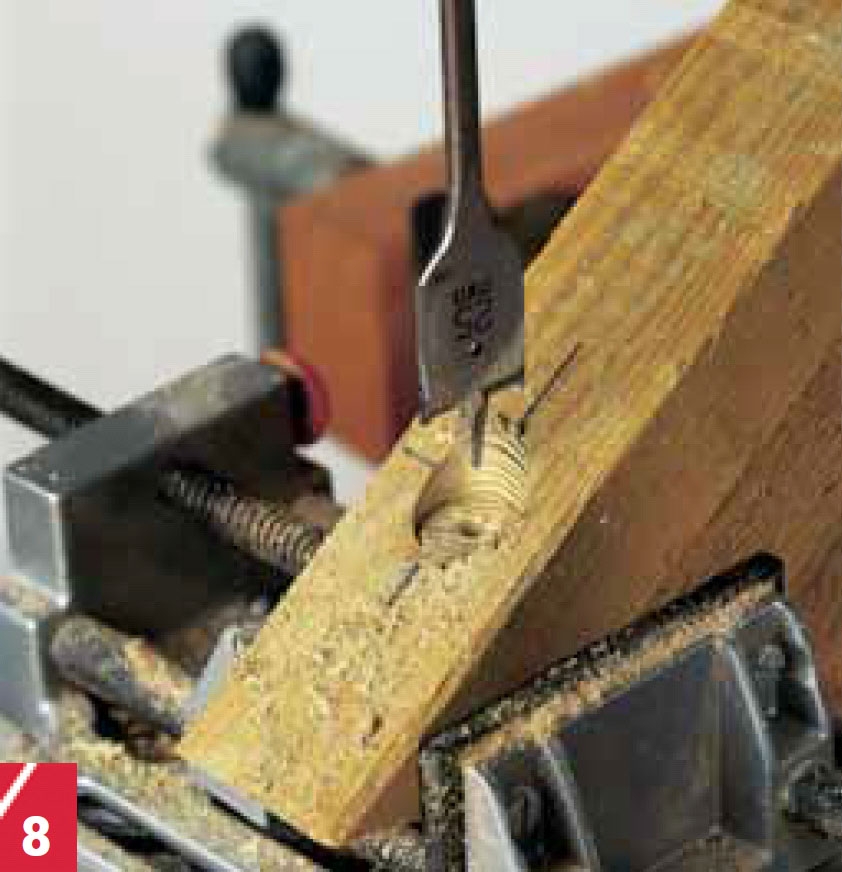Förborra i snedsträvorna (C) med ett 25 mm centrumborr så att du kan försänka de franska skruvarna. Hålbottnen skall vara parallell med strävans ovansida.