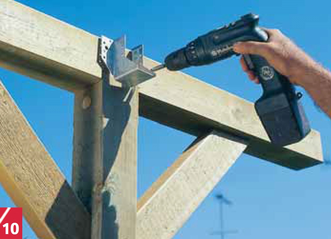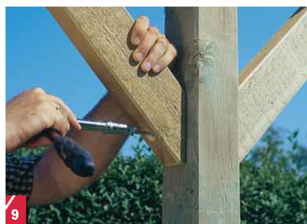 Förborra med ett 8 mm borr i hålet efter centrumborrets spets och dra sedan fast snedsträvorna på stolparna med 8 x 100 mm franska träskruvar.