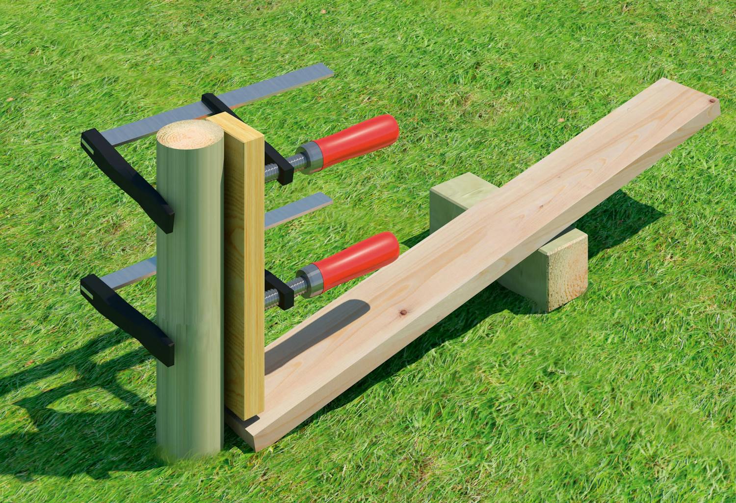 Det smartaste är att först göra ett antal hål i marken med hjälp av en kort stolpe på cirka 80 cm. Den drar du lätt upp igen med hjälp av en kloss, ett par tvingar och en bräda som hävarm. Alternativt gör du hålen med en jordborr. Det går också snabbt. När du slår på en stolpe med slägga eller klubba så spricker träet rätt lätt.