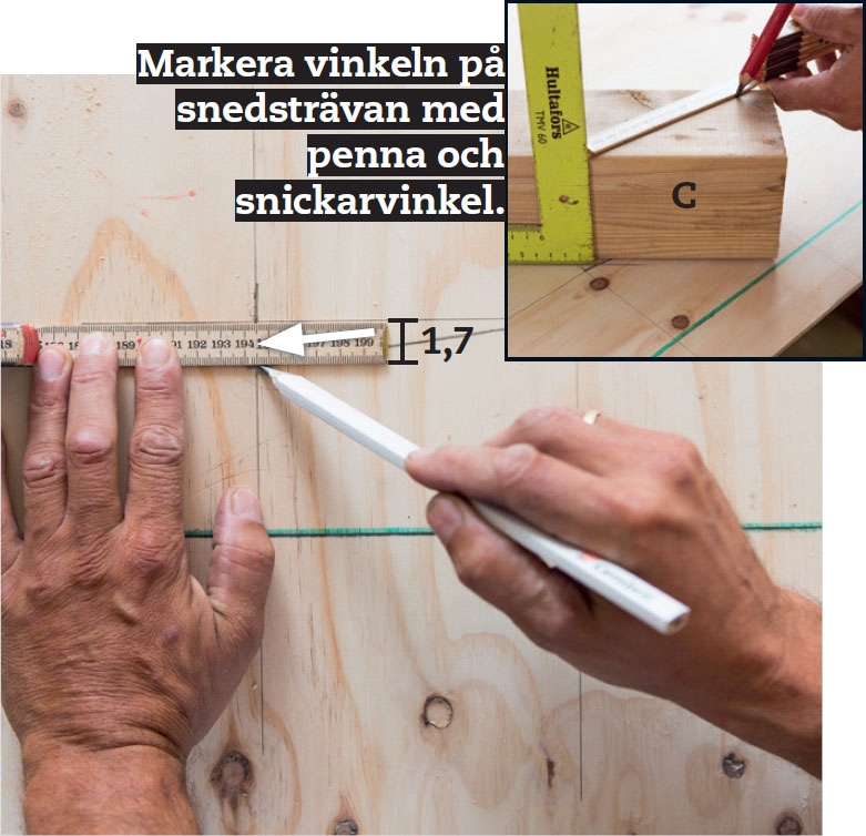 Rita urtaget för snedsträvan C. Lägg snedsträvan på byggskivan och markera var den ligger an mot stödregel A och överliggare B. Urtaget ska gå snett in i träet och vara 17 mm djupt vid bakre kanten (= bredden på en tumstocksled).