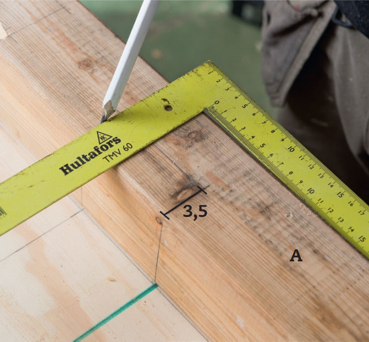 Markera för snedsträvan C på skivan, så att du vet exakt var urtagen ska göras i stödreglarna. Snedsträvan ska sitta i 45 graders vinkel mellan stödregel och överliggare. Markera urtaget 50 cm från ovankanten på stödregeln.