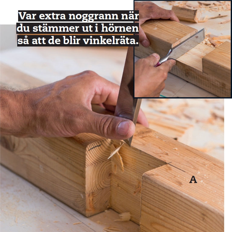Såga ett spår med fogsvans i stödregeln A där urtaget ska göras. Genom att såga rakt och lodrätt blir det lättare att stämma ut med stämjärnet så att det blir snyggt.
