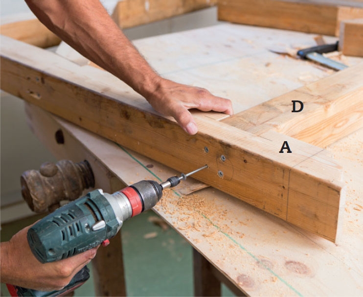 Armarna D fästs på stödreglarna A med lim och skruvar. Lägg på ett par klickar lim i varje fog och fördela limmet. Tryck ihop delarna och skruva ihop dem med 6 x 180 mm rostfria skruvar.