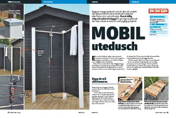 Din nya, snygga utedusch är färdig och nästan klar att användas. Nu kan du göra de sista detaljerna, som exempelvis att skruva fast trädgårdsslangen med kabelmärlor och sätta en skyddande stolphatt överst på stolparna.