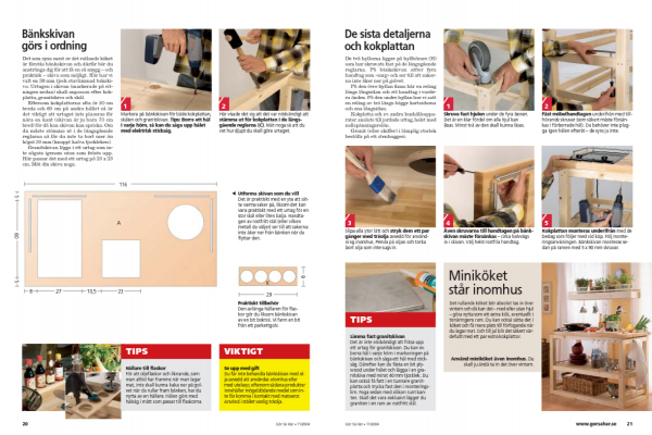 Det som syns mest av det rullande köket är förstås bänkskivan och därför bör du anstränga dig för att få en så snygg - och praktisk - skiva som möjligt. Här har vi valt en 38 mm tjock stavlimmad bokskiva. Urtagen i skivan (markerade på ritningen nedan) skall anpassas efter kokplatta, granitskiva och skål.