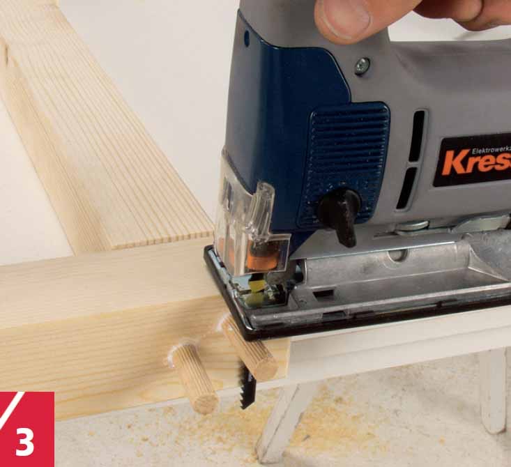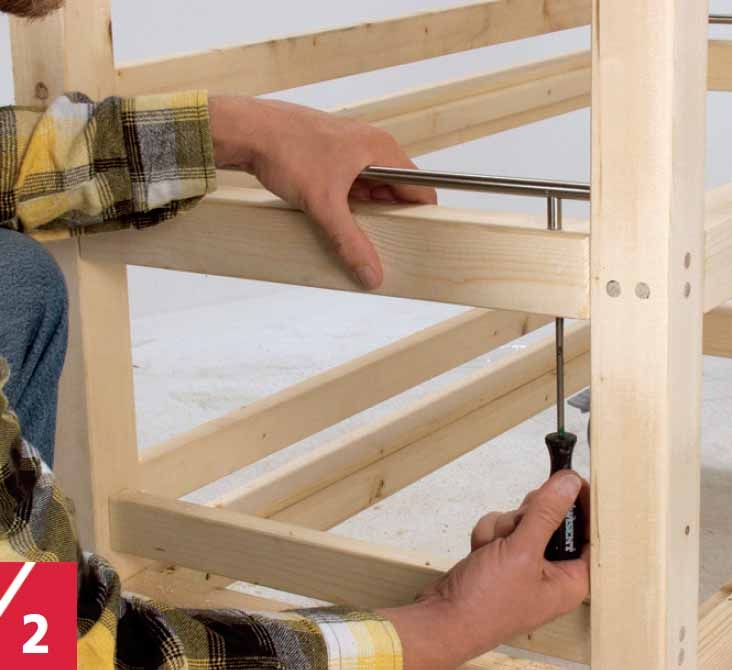 Sätt benen (B) och tvärreglarna (D) i spänn med lim mellan delarna. För att lättare kunna få fatt i handtagen, som senare sätts på de två övre tvärreglarna så placerar du dessa reglar 2 cm från ovankant av benen. Använd ett par klossar som avståndshållare.