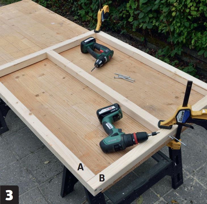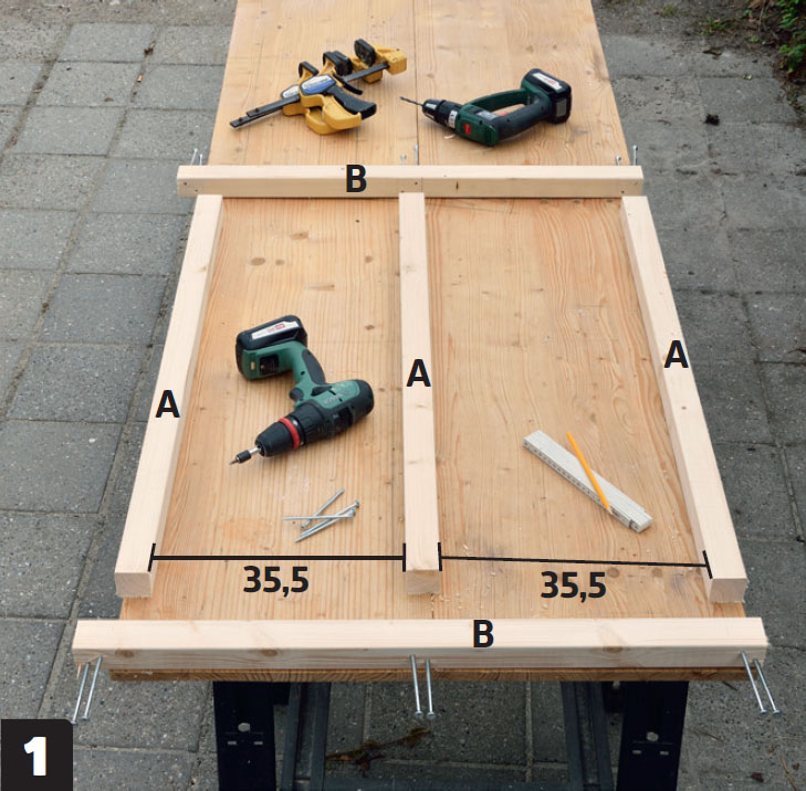 Bygg två sidoramar. Lägg upp tre reglar (A) mellan två reglar (B). De två yttre reglarna (A) ska ligga i nivå med änden på reglarna (B). Mittregeln (A) ska ligga med lika stort avstånd till de andra två, 35,5 cm.