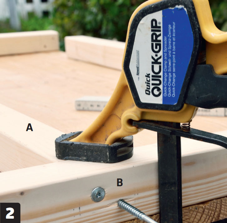 Skruva ihop fogarna (A och B) med 5 x 80 mm skruv. Kom ihåg att förborra innan du sätter skruvarna i ändträet. När du har tillverkat en ram upprepar du processen och gör en till.