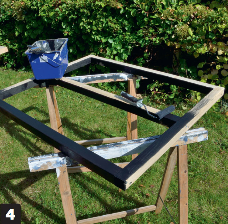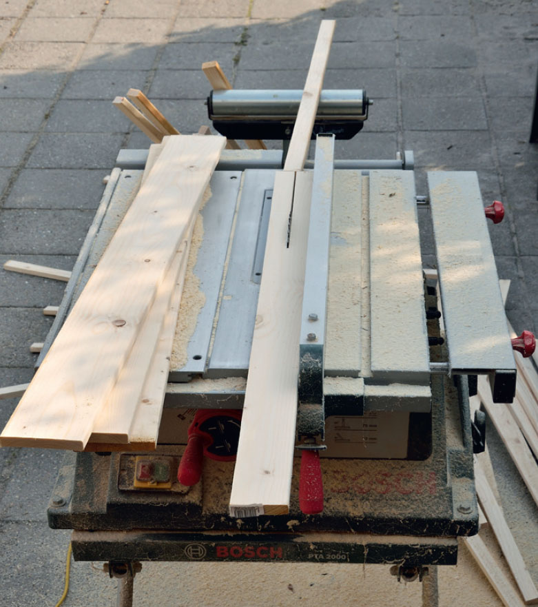 När ramarna är monterade ska de strykas med träskydd. Detsamma gäller för flera olika delar som kommer att användas senare i projektet, inklusive ribborna som förbinder de två ramarna till en stabil stomme.