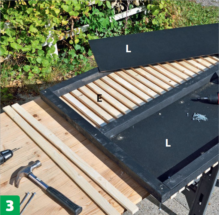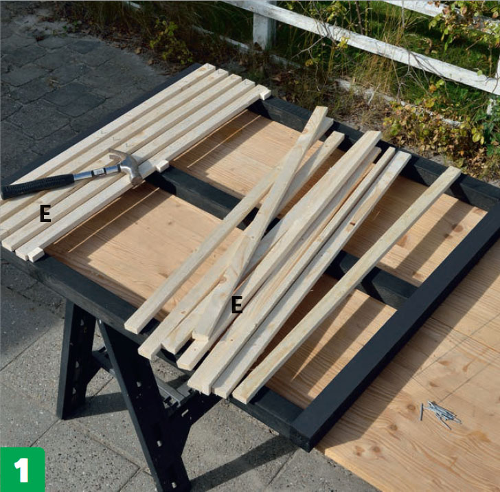 Gör luckorna, en åt gången. Lägg två reglar (D) parallellt på bordet med 66 cm mellanrum. Spika fast 11 ribbor (E) med ett mellanrum på ca 1,75 cm. De yttersta ska vara i jämnhöjd med reglarnas ändar.