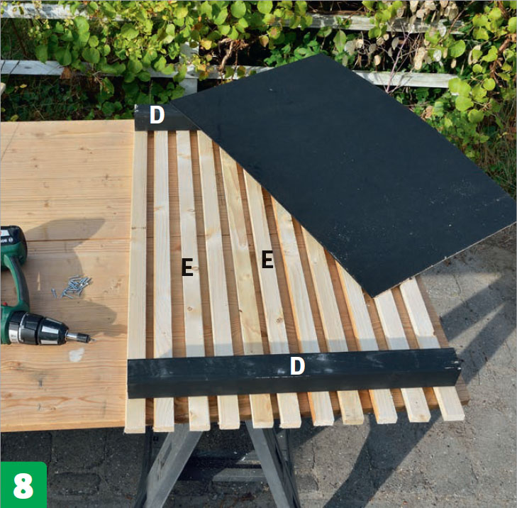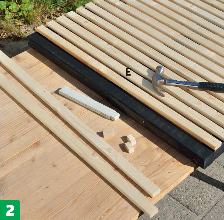 Skruva fast en pinne mellan de två yttersta brädorna (F). Nu har du ett mothåll att lägga de resterande brädorna mot. Placera dem med ca 2 mm mellanrum och skruva fast brädorna med skruvar underifrån.