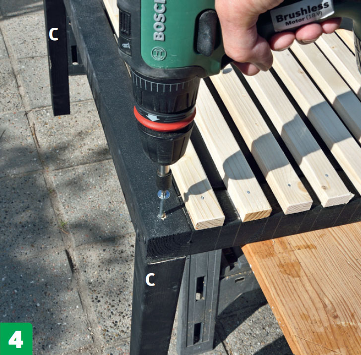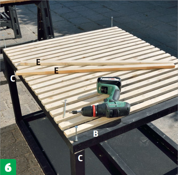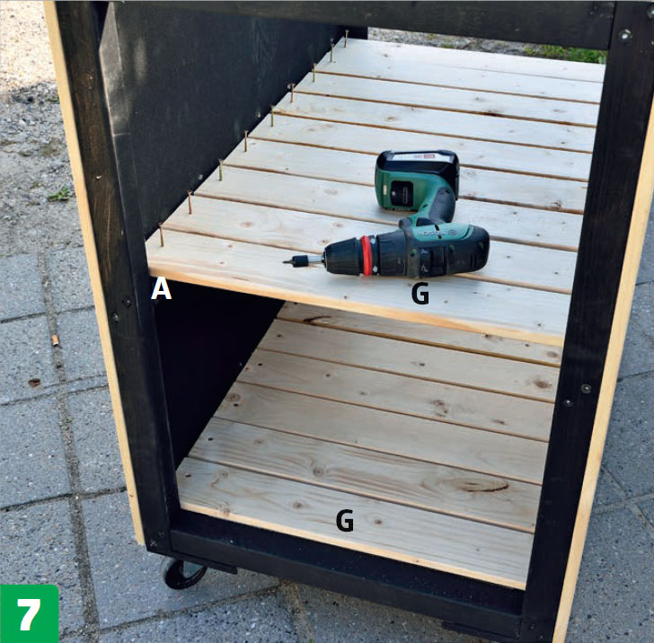 Gör två hyllor. Placera 18 brädor (G) i två lager för att bilda två hyllor mellan ramarna. Brädorna vilar på reglarna (A). Skruva fast brädorna med 4 x 40 mm skruv.