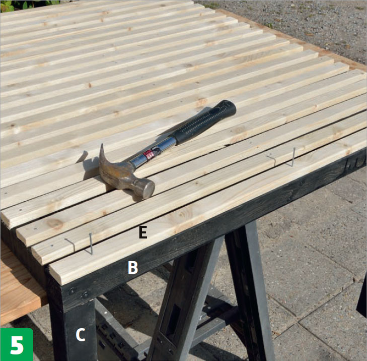Spika fast de två yttersta ribborna (E) på den ram som du just har skruvat fast de fyra reglarna (C) i. Vänd därefter ramen, så att den vilar på ribborna (E).