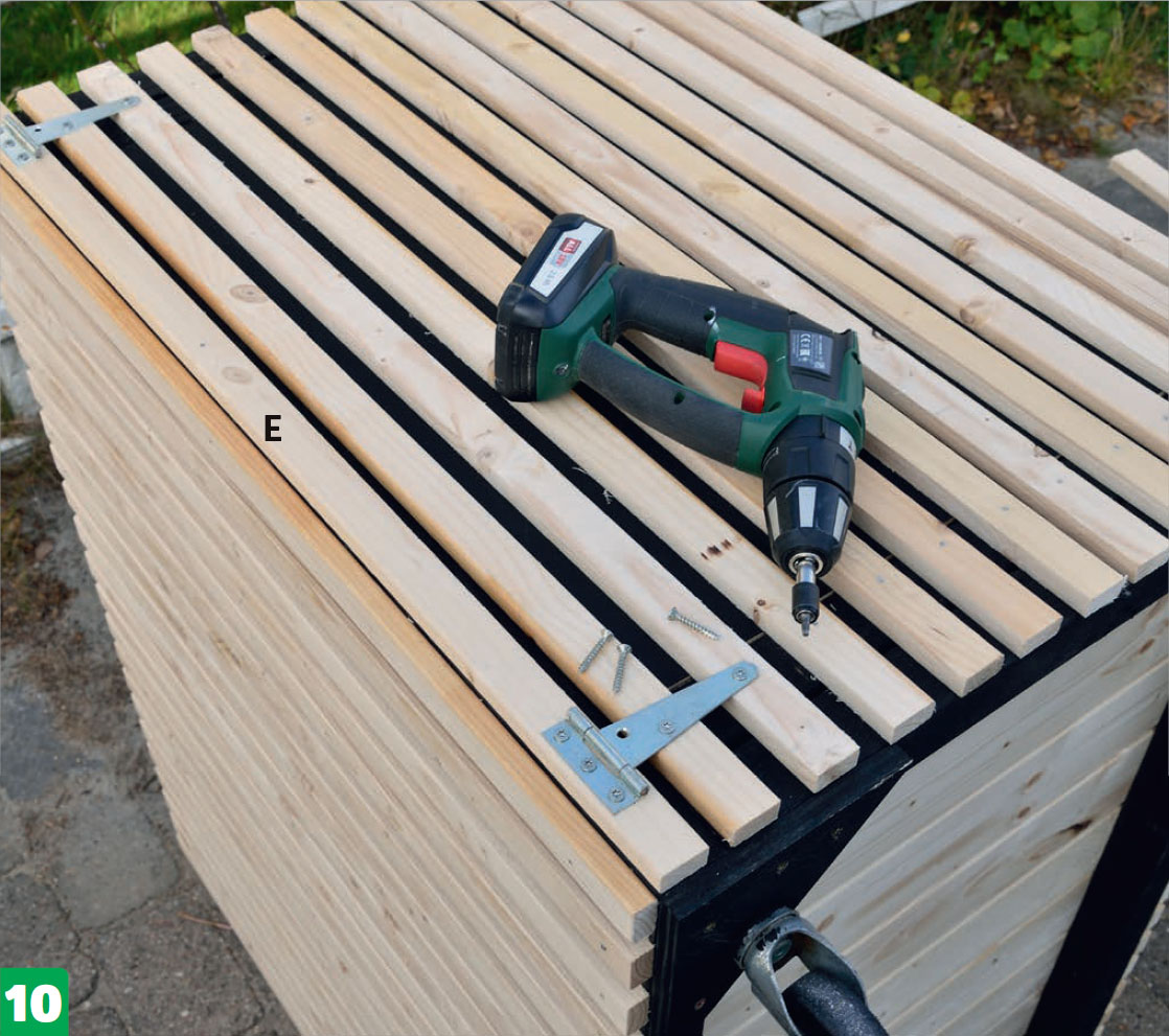 Sätt fast luckorna. Börja med att fästa de sista ribborna (E) på själva ramen. Ribborna ska vara i nivå med kanterna på båda sidor om båda öppningarna. Placera luckorna mellan de nymonterade ribborna och placera gångjärnen ovanpå. Nu kan du skruva fast gångjärnen med 4 x 20 mm skruvar. Du ska också montera ett handtag och en vridhållare för att hålla luckan stängd.