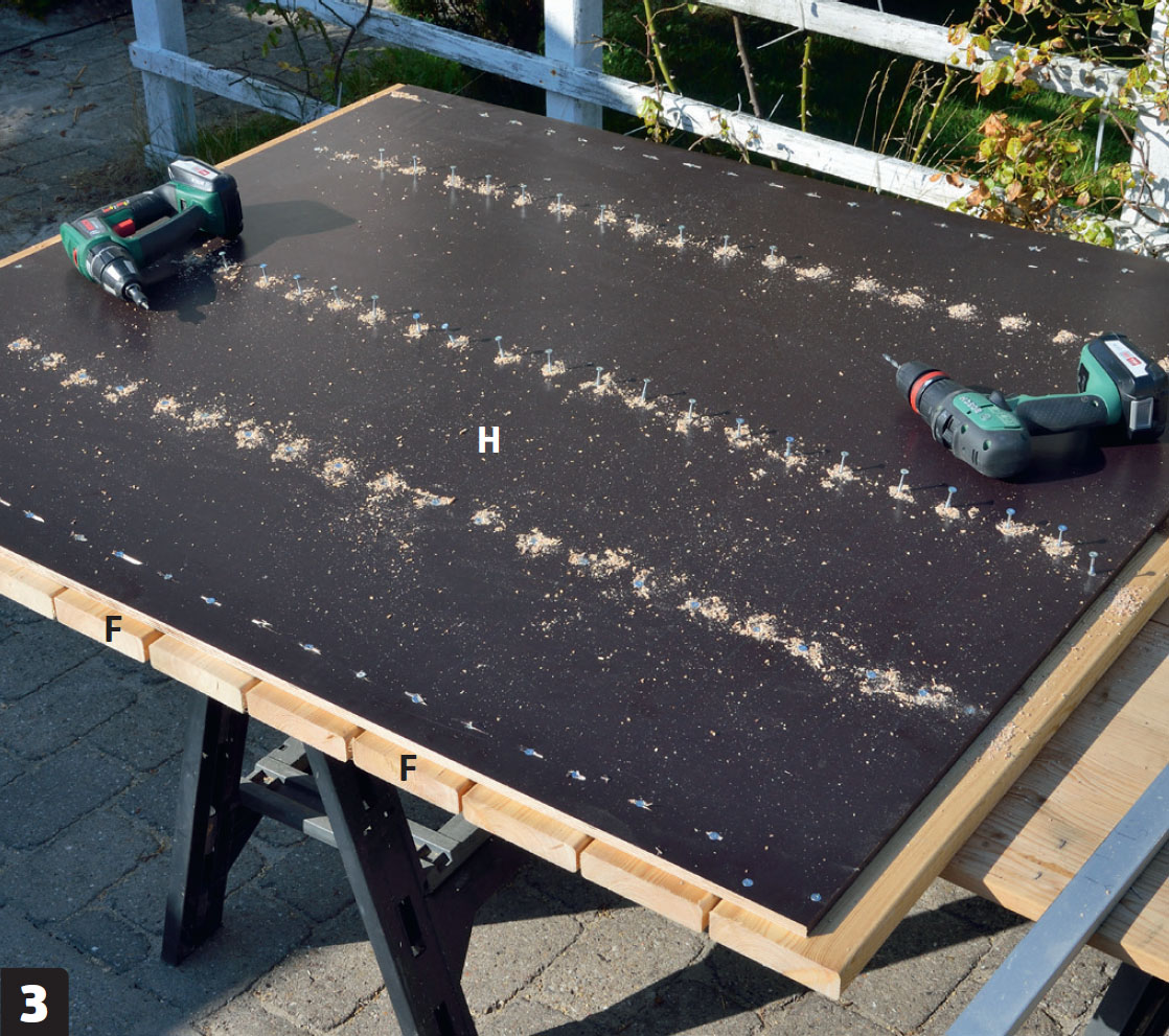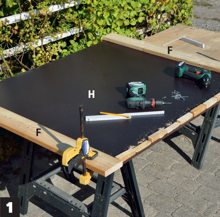 Lägg upp skivan (H) och lägg en bräda (F) på varje sida, så att de sticker ut 4 cm över kanten på skivan. Skruva fast brädorna med 4 x 40 mm skruv - skruva genom skivan först, så att de inte syns på brädsidan.