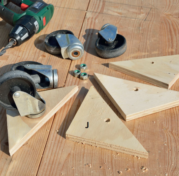 Såga fyra rätvinkliga trianglar (J) med måtten 15 x 15 x 21,2 cm av en plywoodskiva. Fäst ett hjul på varje.