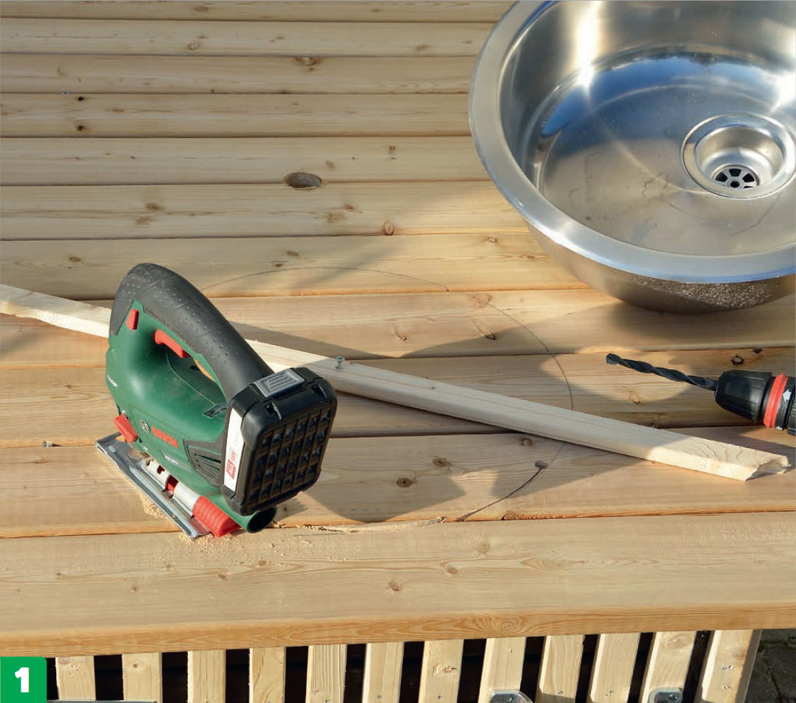 Såga hål för diskhon med en sticksåg. Tänk på att den vattenfasta skivan under brädorna tar längre tid att såga igenom än brädorna.