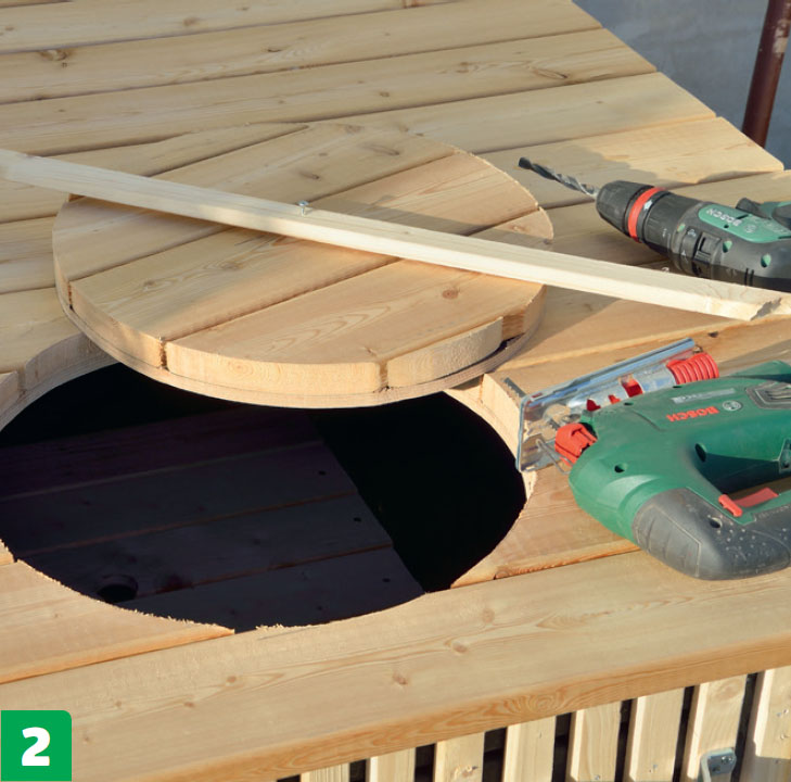 Den sista detaljen du behöver ta hand om är tre hål i bordsskivan och de två hyllorna för att göra plats för ett parasoll mitt på möbeln.