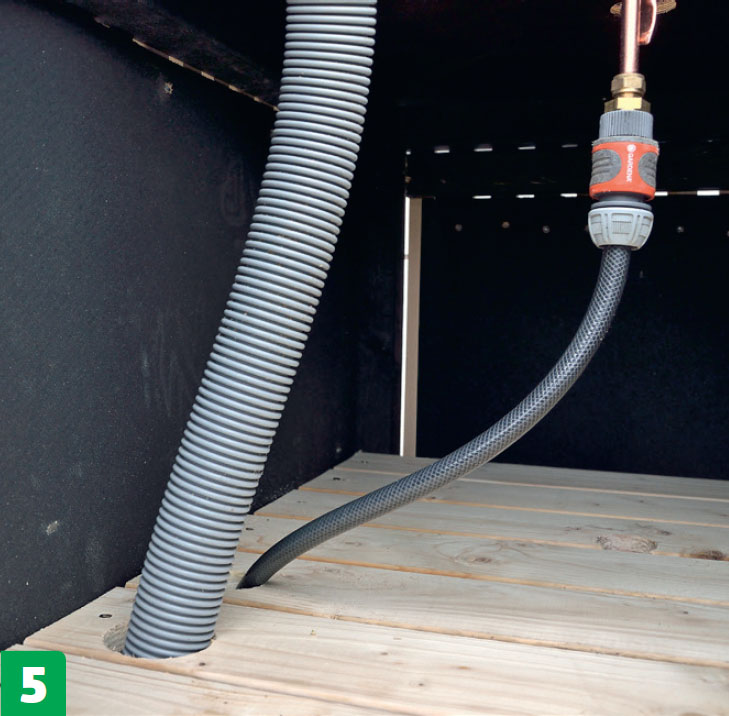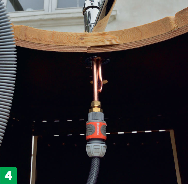 Naturligtvis måste du också göra plats för ett avloppsrör och en trädgårdsslang så att du kan få rinnande vatten till och från köket.