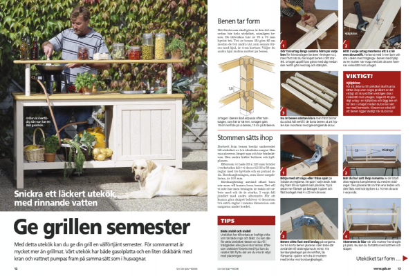 Bänkskivan är 62 x 160 cm och kryddhyllan 18 x 160 cm. Innan delarna monteras på stomme och skåp stryks de med träolja. Kryddhyllan monteras på bänkskivan med hjälp av rundstavar, möbelskruvar och muttersprintar. Då kan hyllan lätt tas bort när köket sätts undan inför vintern.